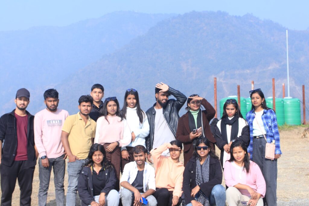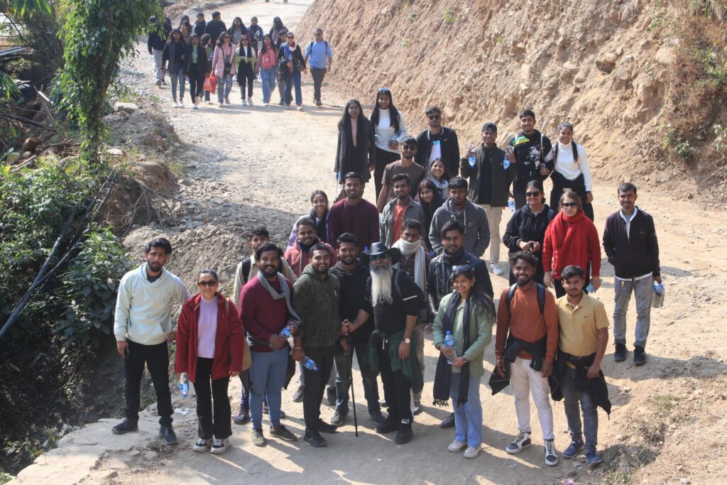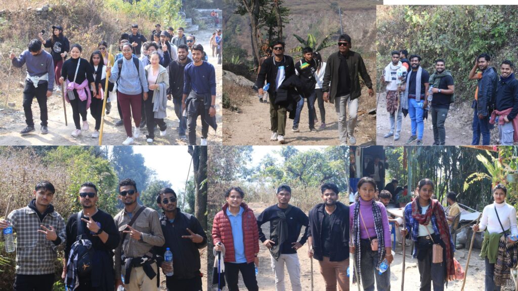 After a short stop at the Vijaypur in Dharan for brunch, the hiking team began their journey, crossing their ascent to the nearby hills, Sardu River, Buda Subba Temple, and the local village on their way to the 7-kilometer hiking trail. The weather was good, and the hiking trail road, surrounded by a hilly landscape, was challenging. So, it took nearly 3 hours to reach the destination. Upon arriving at the destination, the team spent 2 hours on the premises, taking pictures, interacting, and networking with each other.