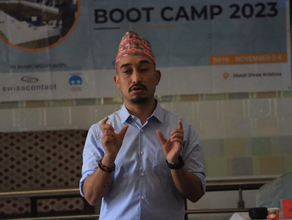 The resource person for the first session of Day 1 was Basanta Adhikari. Basanta Adhikari facilitated the session on Entrepreneurship and its Importance. Participants were divided into five groups during the session with a presentation assignment. Through the assignment, the participants dealt with the five core questions on Entrepreneurship, i.e., What is entrepreneurship? Why is entrepreneurship important to society? Why should I be an entrepreneur? How are entrepreneurs perceived in our society?, What are the conditions that promote entrepreneurship? What are the challenges of entrepreneurship? After 30 minutes of group work, each group presented their opinion in a 5-minute pitch. The best group was selected through a popular vote and rewarded accordingly. Basanta Adhikari provided brief feedback on the presentations and further explored the definition of an entrepreneur, their perception of Nepali society, and how they evolved.