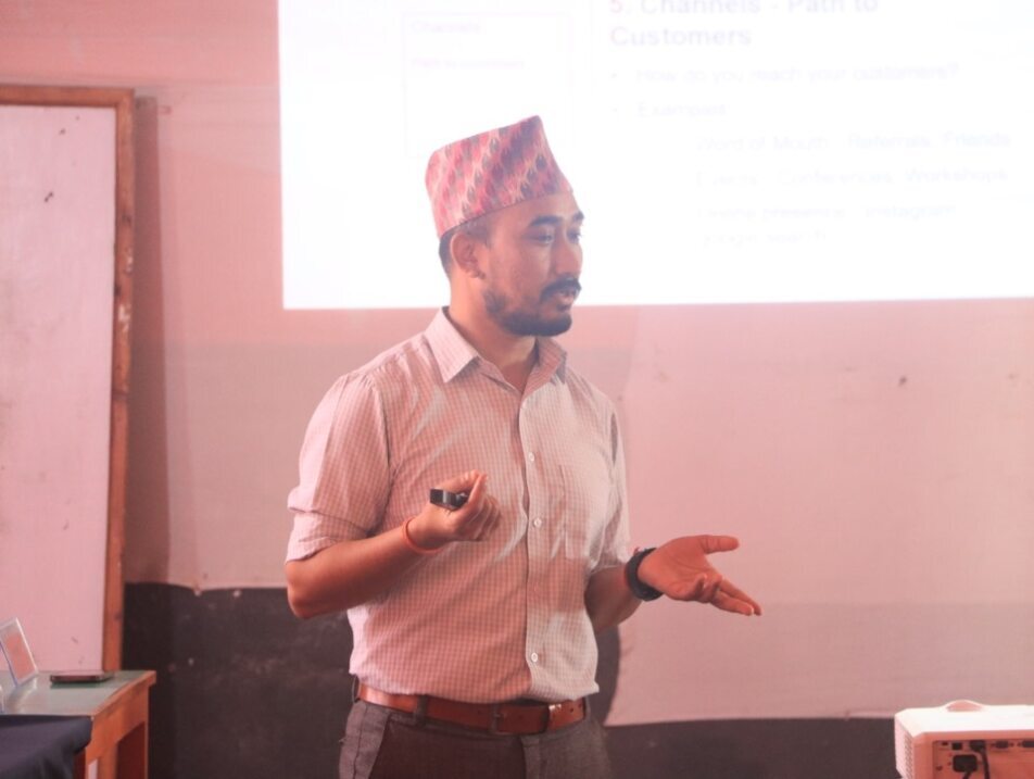 The session began with Resource Person Mr Anil Parajuli providing a clear overview of the Lean Business Canvas and its distinctions from the Business Model Canvas. He said that The Lean Business Canvas is a simplified and visual tool used by entrepreneurs and startups to help them plan, refine, and communicate their business models. It’s a straightforward problem-solving strategy that allows the entrepreneur to progress in small steps. While Business Model Generation Canvas, on the other hand, is solely focused on new and existing businesses, with a strong emphasis on client categories, channels, and customer connections. It promotes open communication, innovation, debate, and constructive analysis.