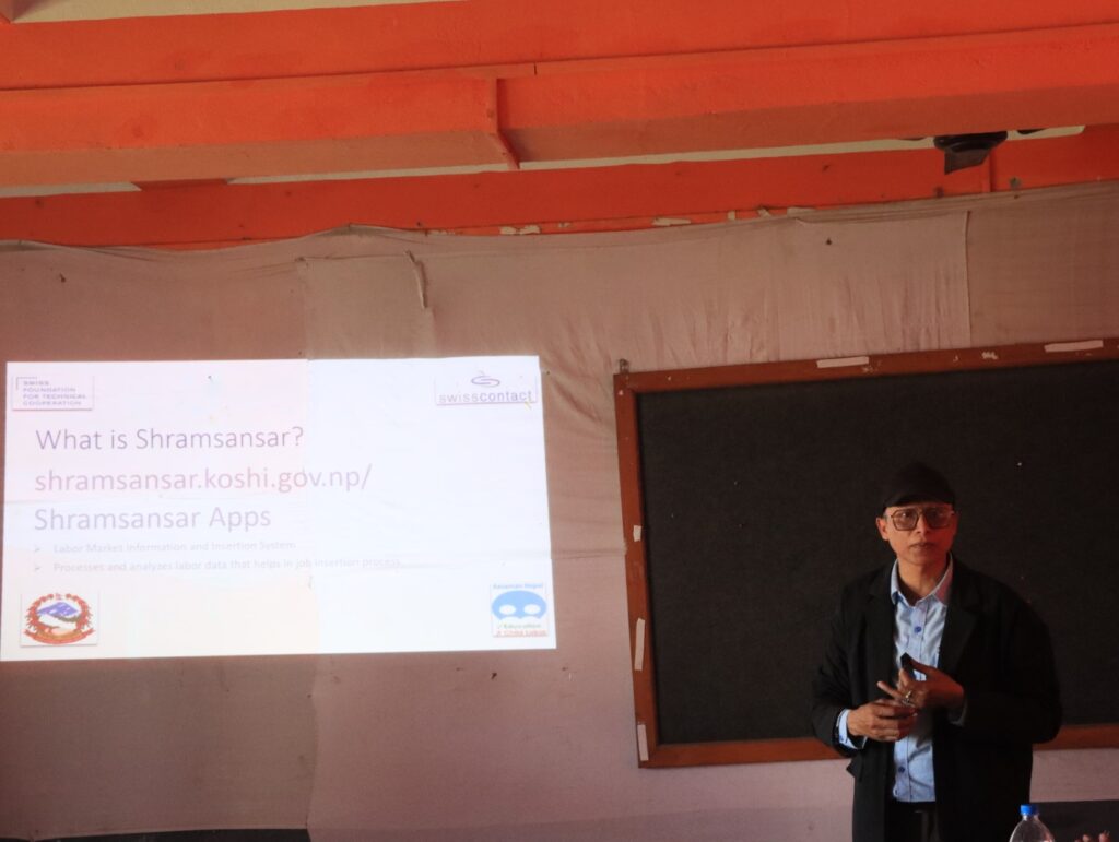 The session commenced by focusing on the presentation of Shramsansar Apps, which can be accessed at shramsansar.koshi.gov.np/. Mr. Ganesh Dahal, the presenter, introduced the audience to the aim and purpose behind the development of Shramsansar Apps. He emphasized that the platform is designed as an information system to provide quick and relevant information. According to Mr. Dahal, Shramsansar Apps are a valuable resource for job seekers and employment service providers, offering them access to pertinent information about the labor market. This user-friendly system facilitates the efficient exchange of information related to employment opportunities, skills development, and labor market trends. He also practically showed the participants the registration process of their data information regarding the Shramsansar Apps. Mr. Ganesh Dahal further elaborated on the objectives of the Stepup Project, shedding light on the project’s mission and strategies for achieving its goals. He shared how they are working with three Local government municipalities to support entrepreneurship development through various means of support. The session concluded with an engaging Q&A session, allowing participants to seek clarification and further information.