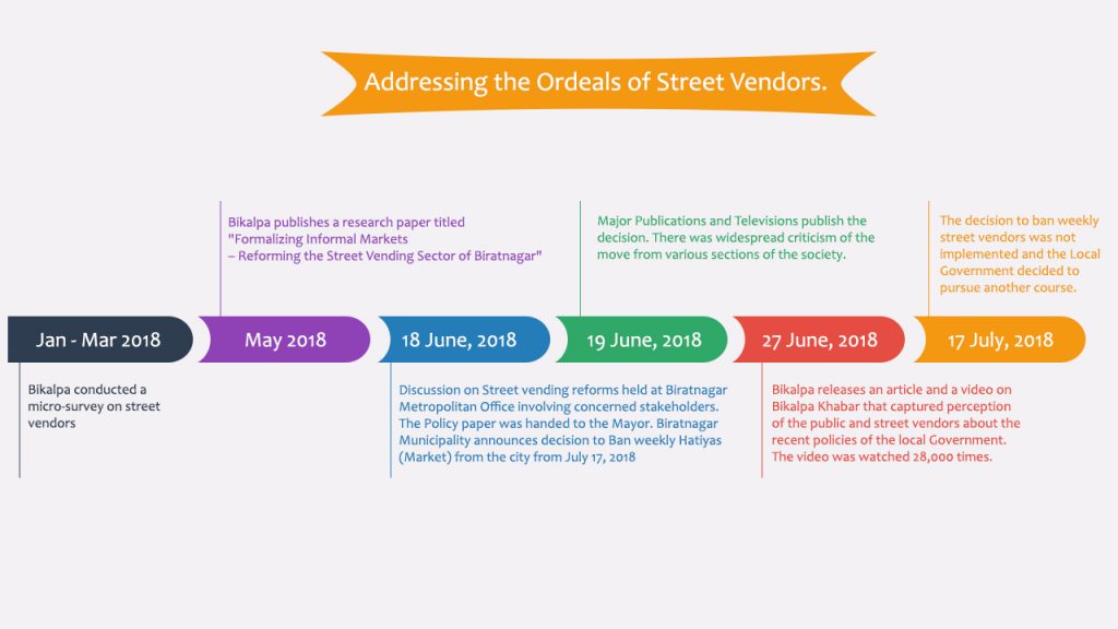 Street vending has been a source of income for many people. There are 19 weekly vendors market in the city of Biratnagar alone which have served as the marketplace for rural traders since ages. In