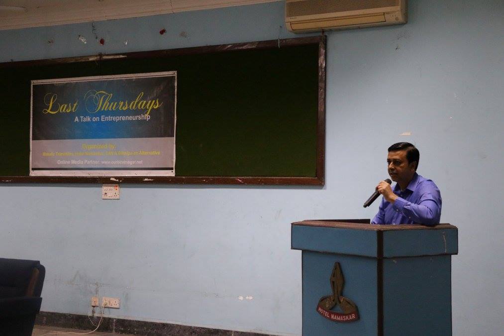March 31 2016 Every Last Thursday of Gregorian month, Bikalpa an Alternative jointly organize the “Last Thursday’s” event at Biratnagar in coordination with Hotel Namaskar, E4N and Makalu Television. Objective of the program is to disseminate the ideas and knowledge about entrepreneurship through the sharing of successful entrepreneurs. Also the program creates an opportunity to do networking and share ideas. On the episode of March, Entrepreneur Mr Abinash Bohra Managing Director of Bhora Group of Industries and Past President of Morang Merchant Association was invited as a guest speaker at the program. Program was started at 4:15 pm. Basanta Adhikari, Director of Bikalpa and Alternative moderated the program welcoming the participants and guest speaker. Rima Shrestha, Director of Hotel Namaskar, shared the objective of the program. She also pitched her short Speech to inspire the audience. After her pitch, guest speaker Mr. Abinash Bohra shares his personal story on the journey of his entrepreneurship.