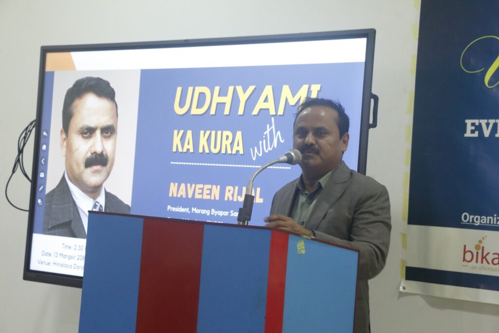 For this Udhyami ka kura session, Mr. Navin Rijal was invited as the guest speaker. Mr. Navin Rijal is the president of Morang Bypar Sangh, central member ( FNCCI), and managing director of Rijalco. Managing Director of Rijalco.The program started at 3:O0 pm with a welcoming speech by Mr. Basanta Adhikari, director of Bikalpa an Alternative. He welcomed the participants and introduced the guest speaker, Mr Navin Rijal, to the audience.