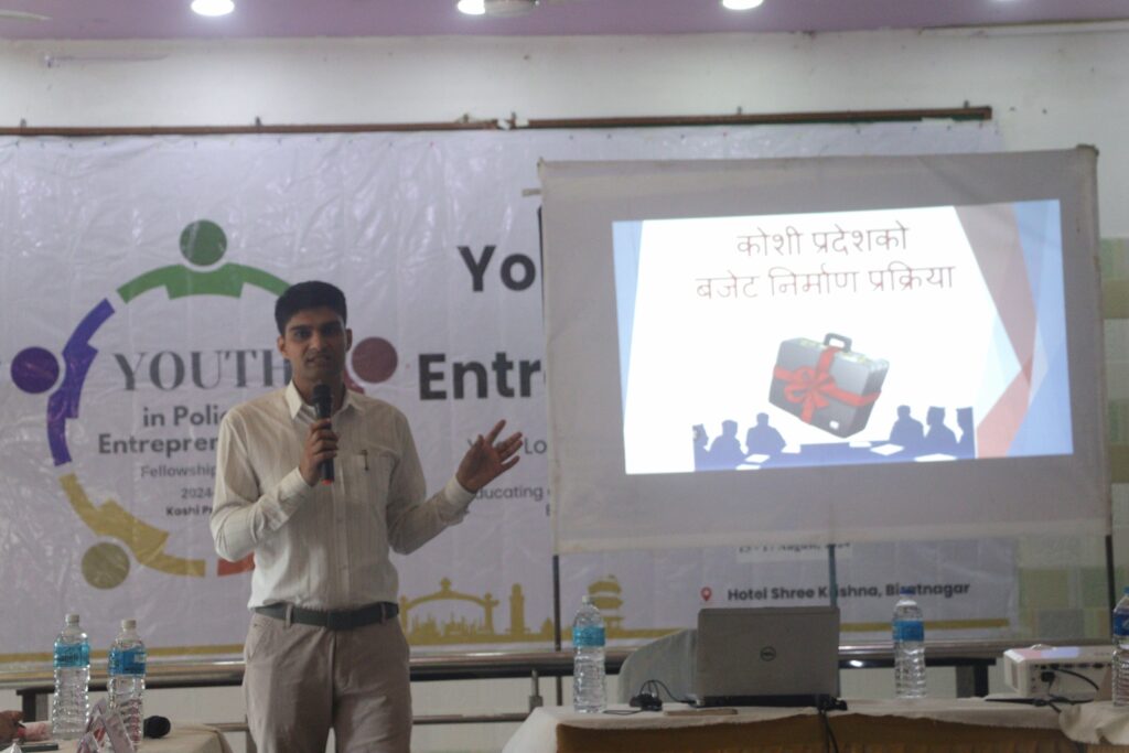 Mr. Bidur Paudel led an insightful session on budget formulation in Koshi Province. He shared The Provincial Planning Commission, along with various Provincial Ministries, Bodies, Offices, and Local Levels, played pivotal roles in this process. They were responsible for setting limits on revenue, royalties, and grants, as well as approving foreign aid and internal loans. Their recommendations on revenue allocations and loan acquisitions were crucial for the selection of projects eligible for complementary and special grants.