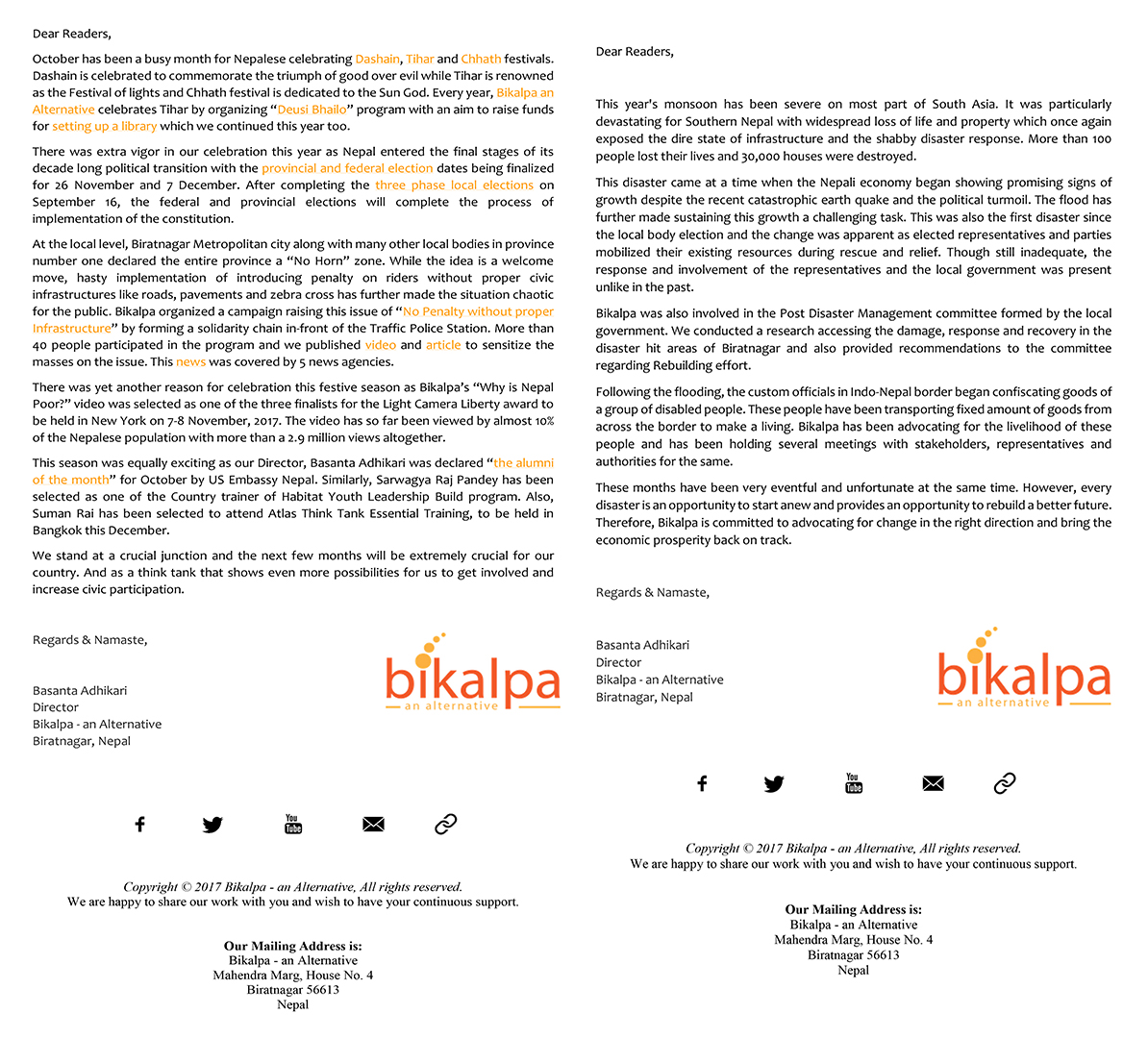 In every two months Bikalpa send its newsletter to its audience. The objective of the newsletter is to update about Bikalpa and its activities to its valuable supporters, donors and well-wishers. It contains major updates of the country, organization progress, activities and impact. So far our updates are reaching to 700+ people.