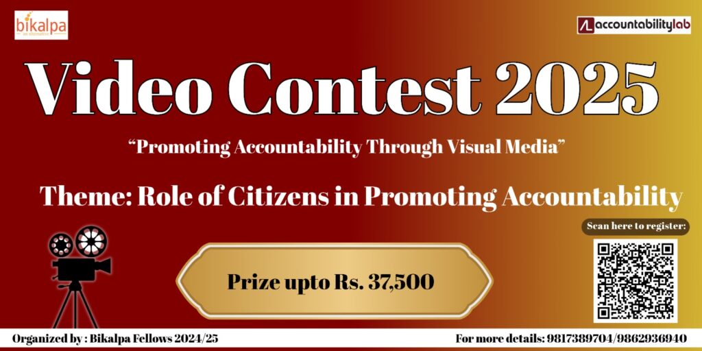 जवाफदेही समाज निर्माण गर्न तथा आम नेपाली नागरिकहरु बीच सचेतना जगाउन हेतुले विकल्प-एन अल्टरनेटिभले एकाउन्टिबिलिटि ल्याब तथा बिकल्प फेलोजको सहकार्यमा जवाफदेहिता भिडियो प्रतियोगिता संचालन गर्न लागेको कुरा यहाँ समक्ष जानकारी गराउन चाहन्छौ l यस कार्यक्रमको उदेश्य भिडियो मार्फत समाजमा रहेका जवाफदेहिता मुद्दाहरूलाई प्रकाशमा ल्याई सर्वसाधारणहरूमा सचेतना जगाउने तथा सेवा प्रदायक व्यक्ति तथा संस्थाहरुलाई जवाफदेही बनाउनको निम्ति दबाब दिने रहेको छ l